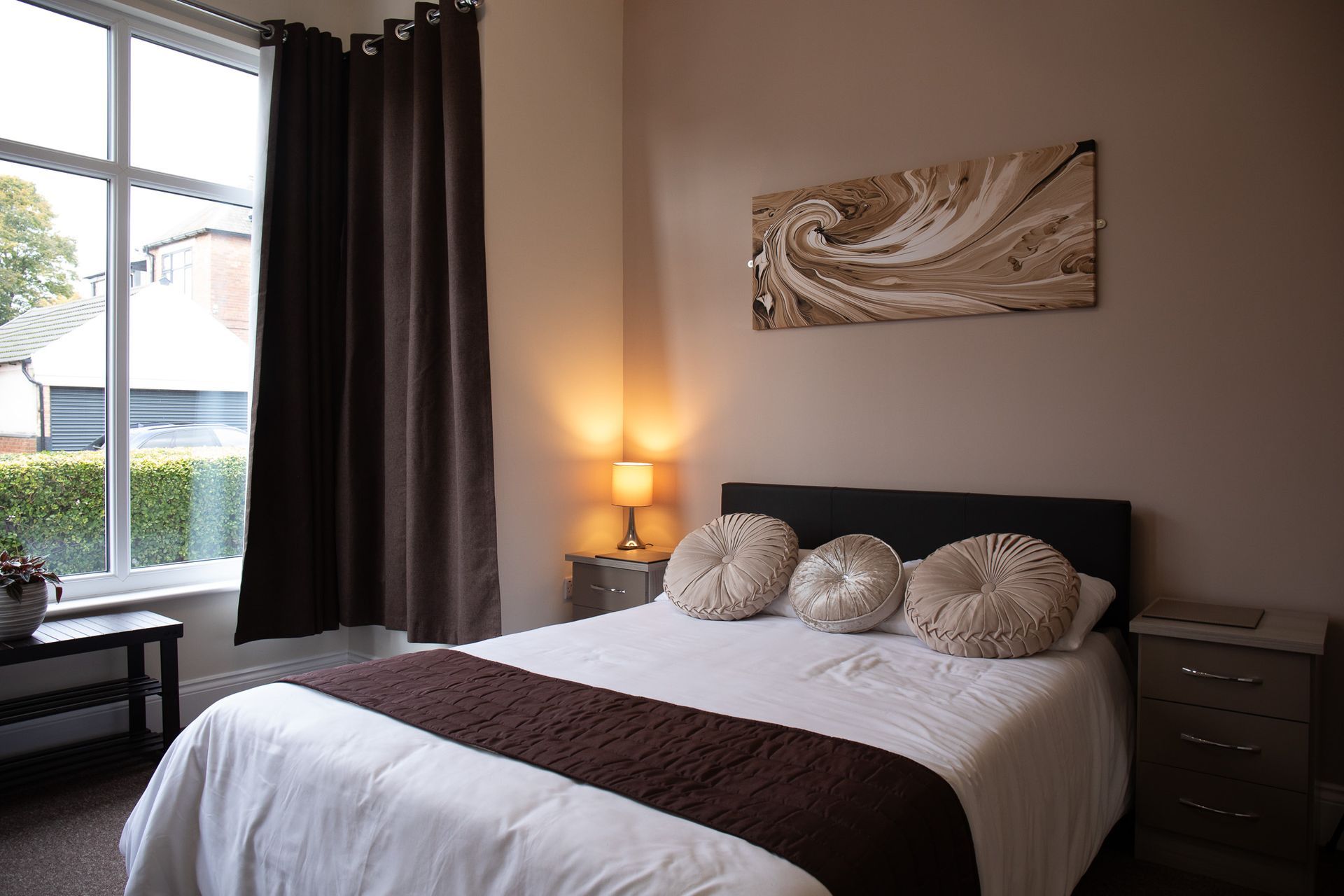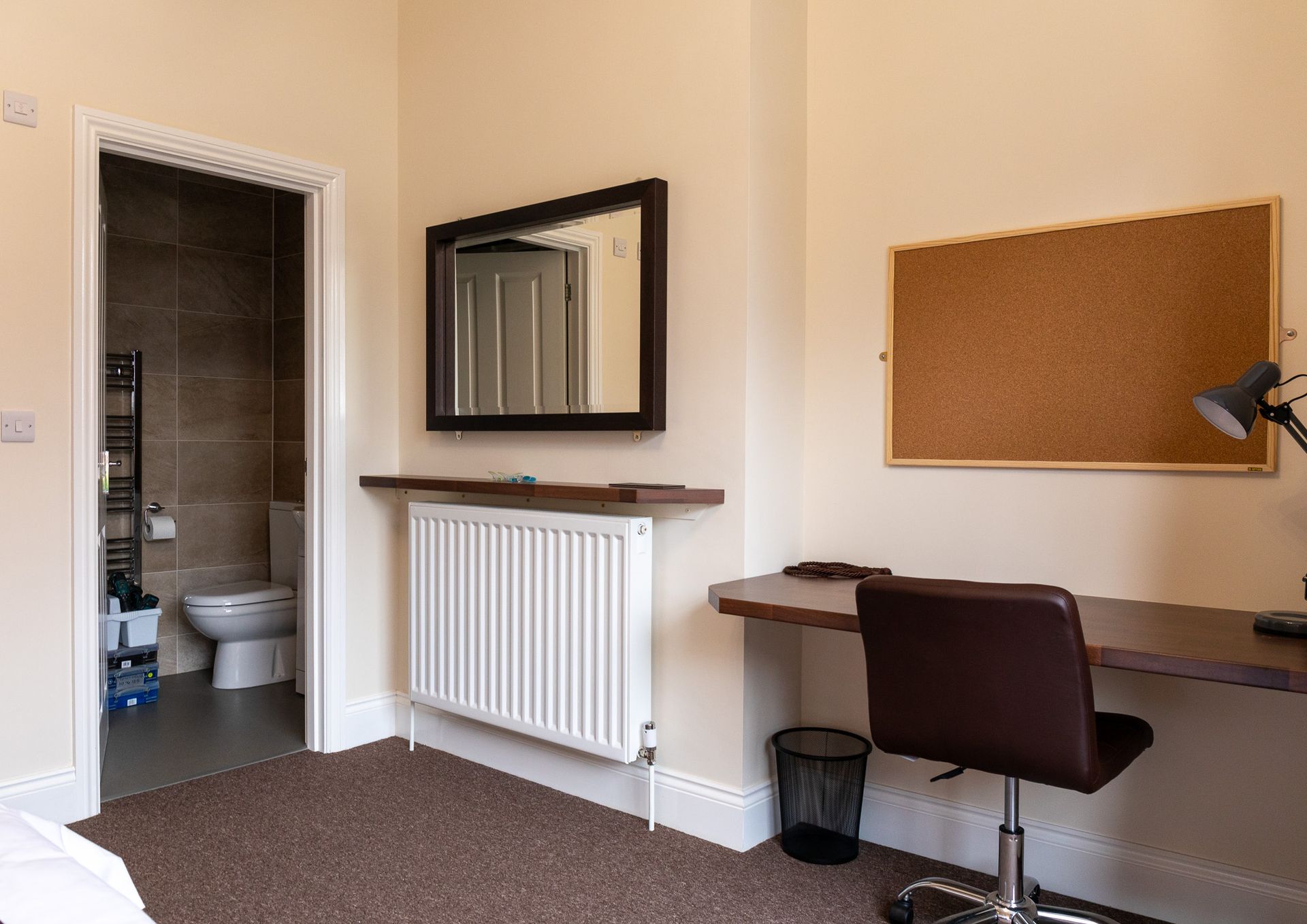 A Modern room with matching furniture that offers plenty of storage options, and the double bed features extra space underneath for belongings. Equipped with a desk and an office chair with access to an ethernet connection, the room is ideal for work or study. A spacious bay window made of double-glazed uPVC ensures the room is bathed in natural light, which includes a built-in fire escape feature. Additionally, the room boasts a generous en-suite bathroom, making it a perfect choice for those preferring to stay on the ground level.